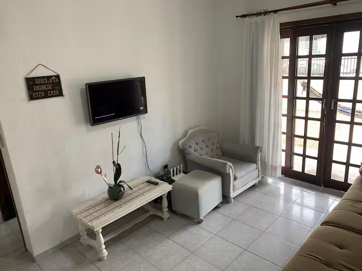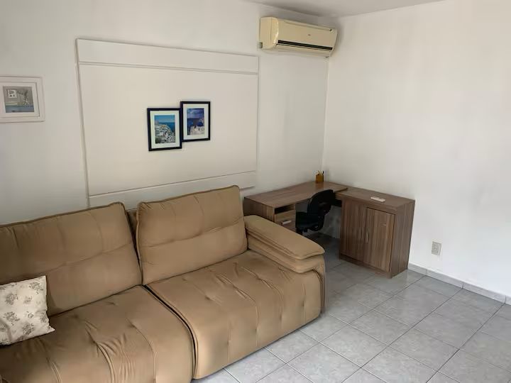 Sofá grande, com TV de 32 polegadas, ar condicionado.